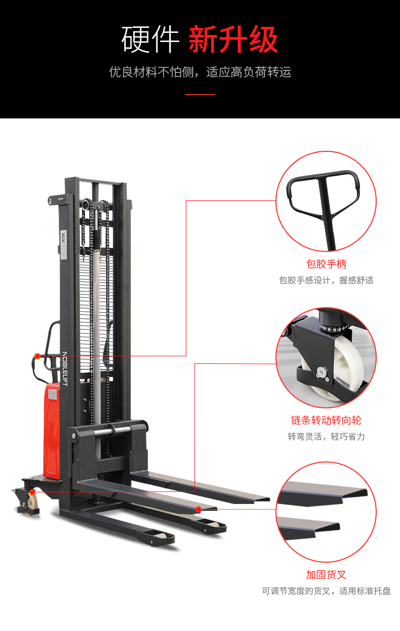 SPN系列半动堆高车式段距离搬运不行车辆,邮箱载荷可达1000kg/1500kg,提升高度最大可达3500mm。特别适合在位置收到限制的使用场合,尤其在窄巷道中表现更为出色